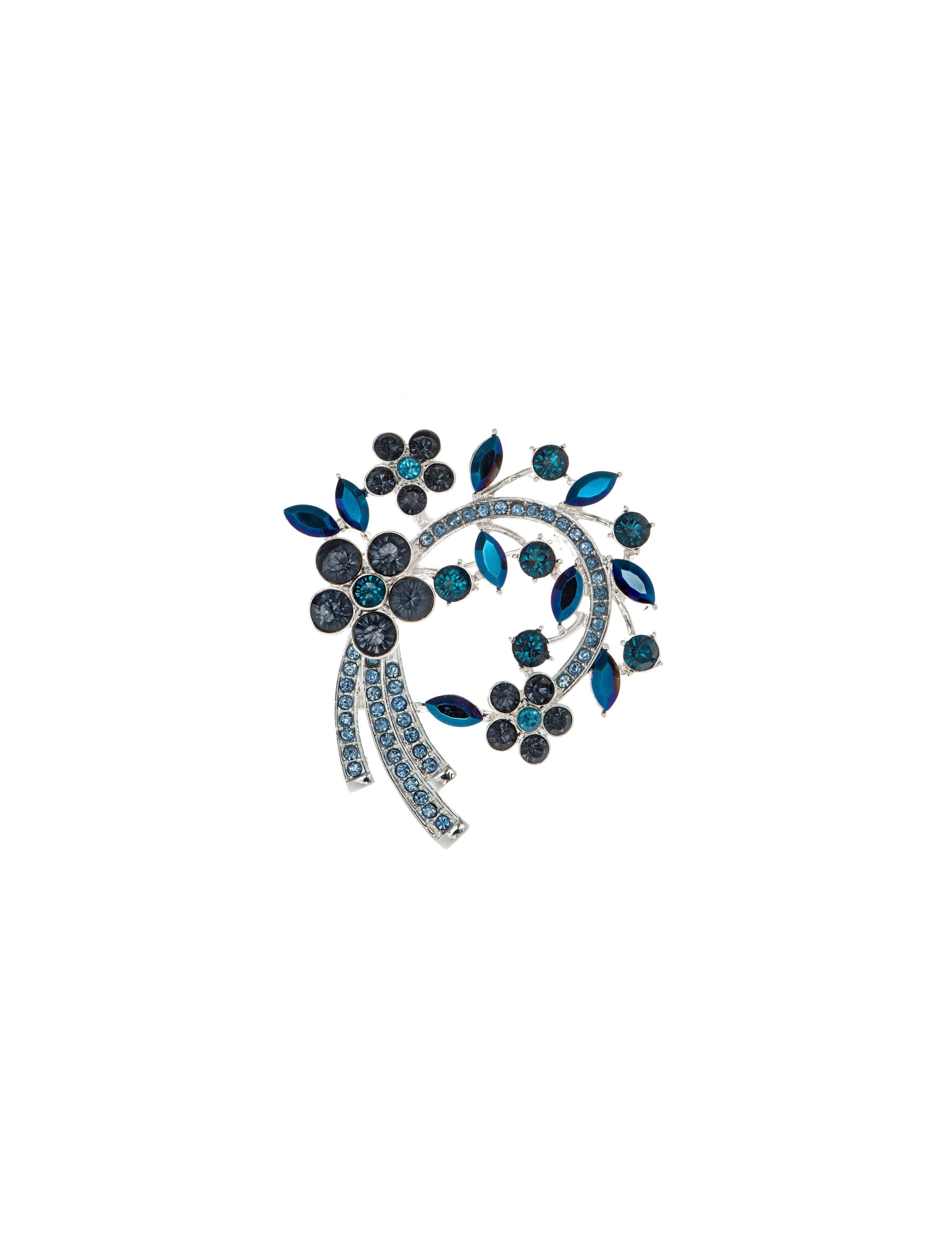 This silver-tone cluster brooch is arched in design and complete with hues of blue crystals for a dazzling finish.