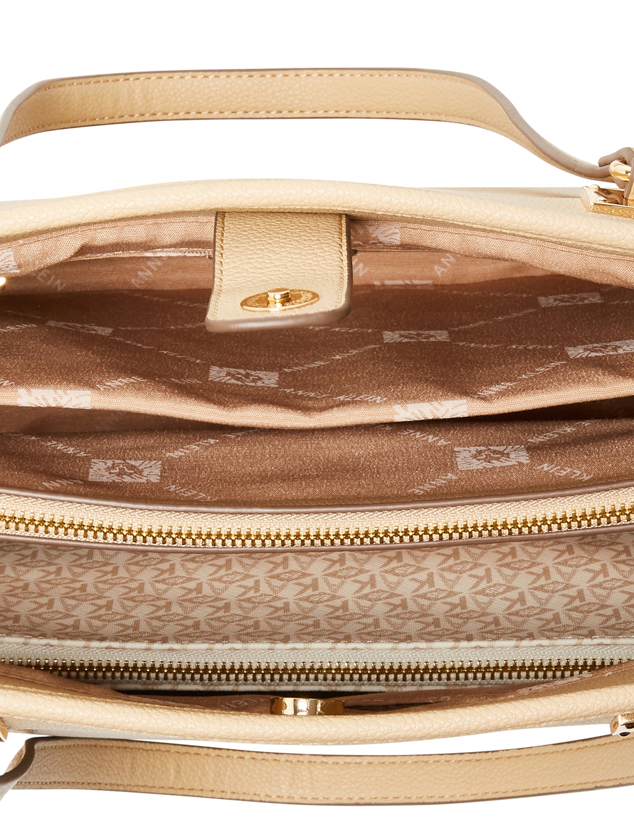 - Interior functions include one center zip compartment, one zip pocket & two slip pockets