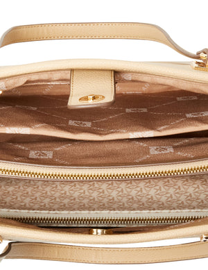 Our work tote is a neutral toned beauty. This enormous tote comes with all the functionality you could ever want plus a fun, printed removeable pouch. This bag displays elegant hardware at the hinges and comes lined with a laptop sleeve.